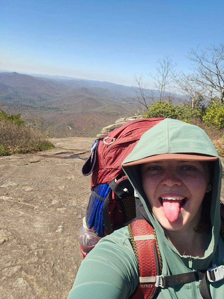 We met another thru-hiker, “Hottness,” who made a lovely quote: “I haven’t seen women!” She was telling us how excited she was to see women hikers out here because all she has seen are men, which made us all crack up! I chatted more with “Views” (from Ohio) and Mille (who has received a trail name and is now called “Pig”). They are doing a section hike to Knoxville, TN, to see how hiking with a dog is different from hiking by oneself. We caught “Baby Talk” at Mtn Crossing and got to chat some more before she took off for camp.