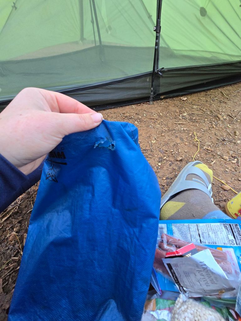 It was a chilly night in the 40s, I’ll have to wear more clothes at night going forward. I had my first encounter with a dreaded little mouse. It’s impressive how such a small creature can alter your day and plans for the next few days. I had placed my food bag in a bear box at the shelter, and mine was the only one in the box. The boxes are designed to keep the bears out… but they said nothing about the mice. Mr. Mouse was hungry last night and chewed a hole in my food back and my tortilla bag and nibbled on some of the edges of the tortillas. As a parting gift, Mr. Mouse also pooped all over my food bag and in the tortilla bag. This event resulted in a slower morning since we had to switch the tortillas to a new bag and mend the hole in the food bag. I can’t blame the little guy. He has to eat too!