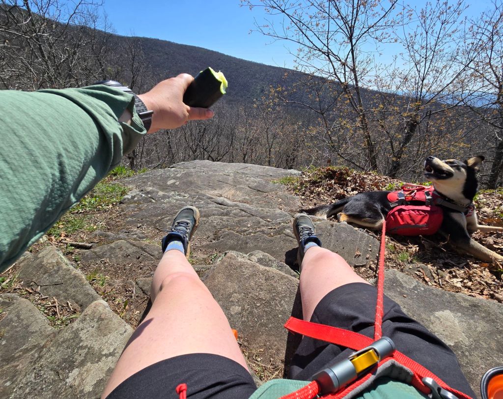 At the shelter, “Poppins” and I chatted. She completed a through hike back in 2017 with another dog and is now doing a section with her current dog, Daisy. She shared a scary story with me from her thru-hike. Her last dog was walking in front of her, and nose dived into the leaves, letting out a horrible squeal moments later only to reveal 2 large fang marks on its nose. A copperhead had bit the dog, and the dogs face started swelling rapidly from the venom. She just barely made it into town to get to a vet within the 24-hour window, and the dog and her had to go off trail for a bit. Sadly, 3 years later, the dog passed from liver failure due to the venom of the snake. I am now very cautious about letting Bo roam around leaf piles or down woody debris.