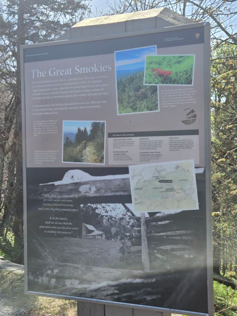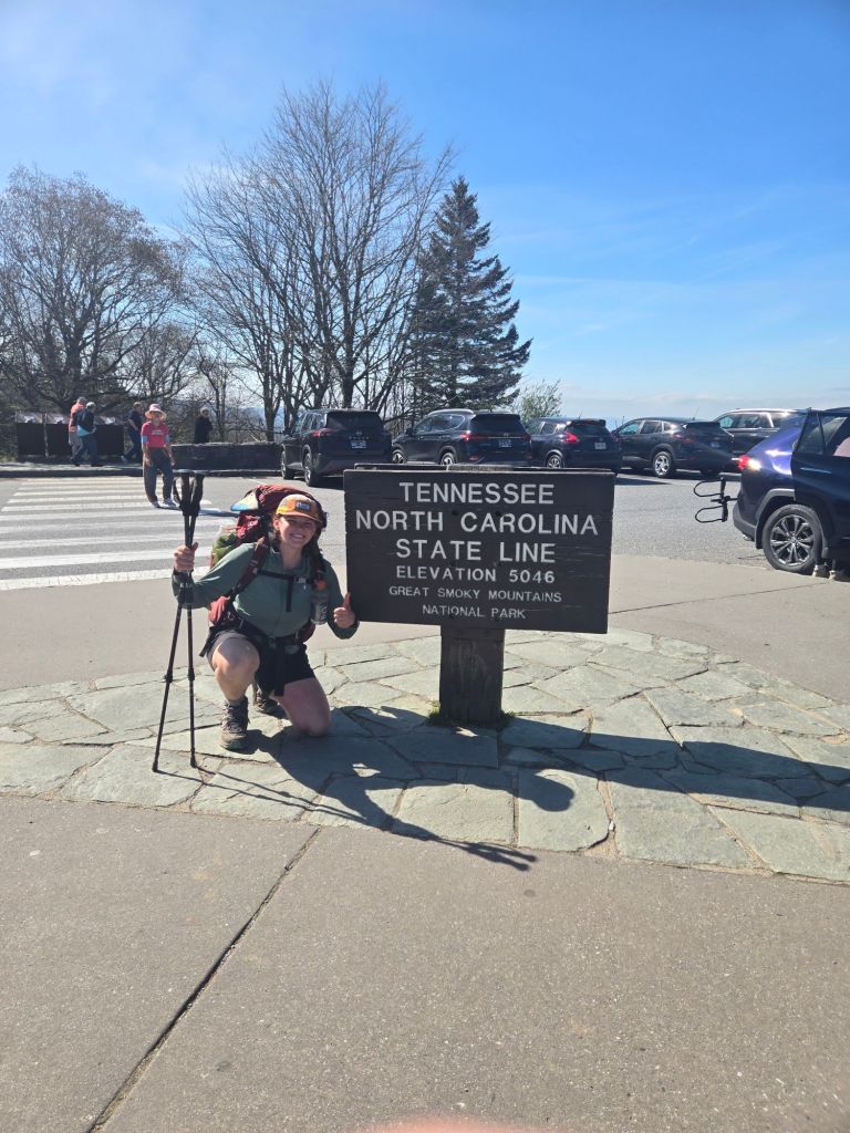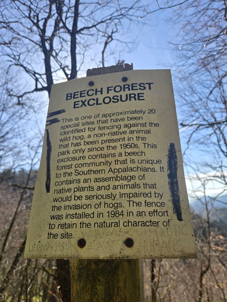 I decided to do a shorter day today in order to slow down and bit and really savor my time in the Smokies, when it seems like everyone else is rushing to get out of the Smokies. I hiked 5 miles to Newfound Gap where… you guessed it…trail magic was waiting! A Baptist church was set up with all kinds of snacks and drinks and charging banks for hikers. I got my pictures taken with the TN and NC signs as well. I saw “Leapfrog” at the trail magic as well! After leaving the trail magic, I had to fight my way through the tourists to get back on the trail. They were stretched out across the entire trail, taking pictures of the AT signage. Once I got through, I hardly saw any tourists for the rest of the day. It seems they would rather enjoy the views from the parking lot than embark on a steep climb, haha. I walked through a fenced area into a Beech forest enclosure designed to prevent wild hogs from going in and tearing things up… but for some reason, they allow ratty thru-hikers to go through.