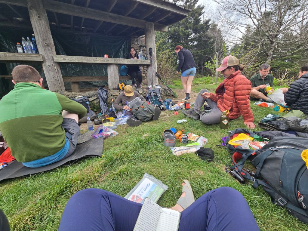 It was a gradual climb all the way to the shelter, and I thought about pushing another 7 miles to the next shelter but decided to stay and enjoy the grassy overlook. I ate the rest of my free burrito and journaled while looking off into the distance. Later, “Howl” (who is now going by “Alpha”) joined me, followed by “6-string,” “Poptart,” and “Thirsty Boy.” I met “Luna Moth” and her dad, who joined her for a couple of days for the Smokies. We all had a little picnic in the grass as we ate dinner together.