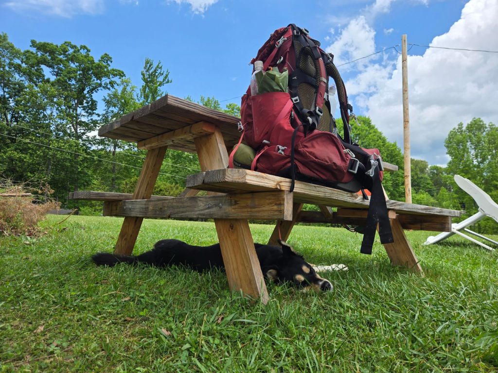 Spoons and I arrived at the hostel and went stayed in the bunkhouse, which was a little blue shed. Bowen arrived soon after and was pulling the dog lady all across the lawn to get to me. It was a wonder how she managed to stay on her feet. Spoons and I washed clothes in a hose by the outdoor shower while Bo napped under the picnic table. We hung out in the grass until the hosts got home from work, and then we went to Walmart. They picked us up pizzas, and we ate inside with them and chitchatted. Bo managed to open the latch on the shed and escaped once, and then once more after I had him on a leash in the shed. It stormed pretty bad during the night, so Spoons and I were grateful that we opted to stay in the bunkhouse rather than our tents.