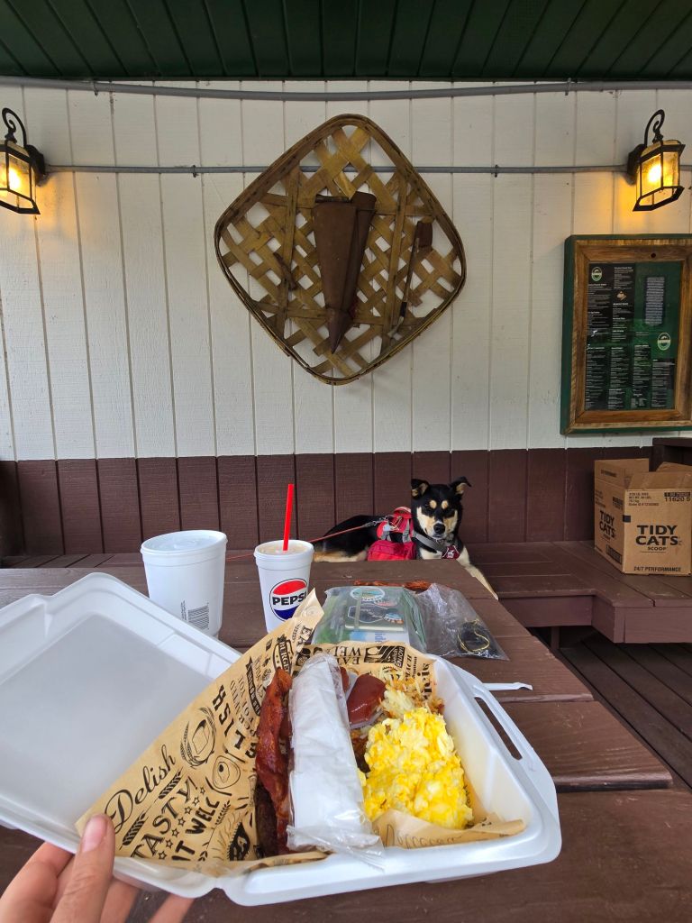 At the Diner, I set Bo up outside at the picnic table while I ordered: eggs, sausage, bacon, hashbrowns, biscuits and gravy, and orange juice. Bo ate bacon, and we chowed down together before planning out our next resupply point. After breakfast, we went to the dollar general to get food to get us to Erwin. I still have yet to craft the art of resupply and keep buying too much food to where I have extra when I get to the next town.
