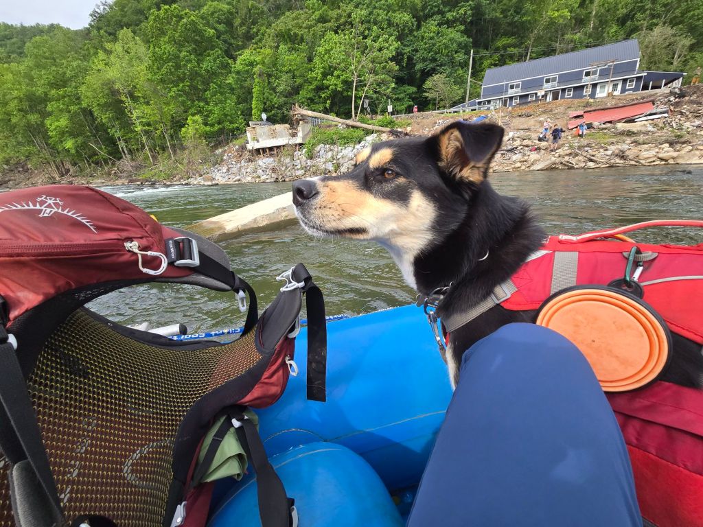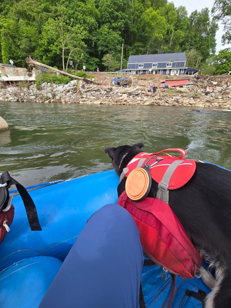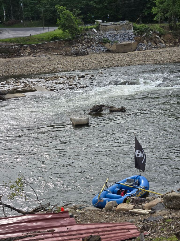 I got to sleep in until 0730, since the raft doesn’t start taking people across the Nolichucky River until 0900. The bridge was taken out during Helene, and you could see remnants of the bridge scattered throughout the water. It flows pretty quickly, and there is rebar and other sharp debris in the water, so wading across isn’t recommended.