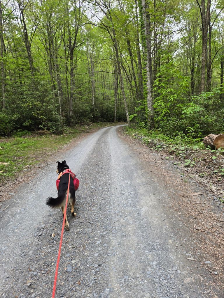 When we got to the campsite there was glass shards everywhere–some people really do ruin nice things. I worried about Bo’s paws getting sliced up and tried to move as many pieces as I could. I ate dinner and soaked my feet in the creek- another Rambomb, hot chocolate and a honey bun down the hatch! I am hoping that the rest of the Detour isn’t as sketchy as the comments on FarOut have made it out to be. I nearly got hit by a car on the road walk section when they came barreling around a sharp turn.