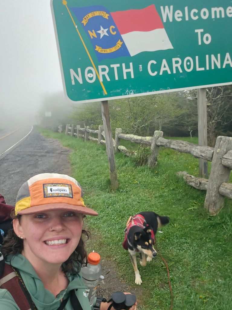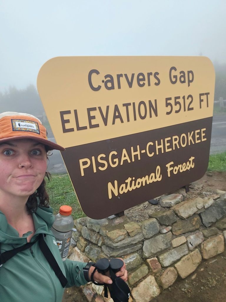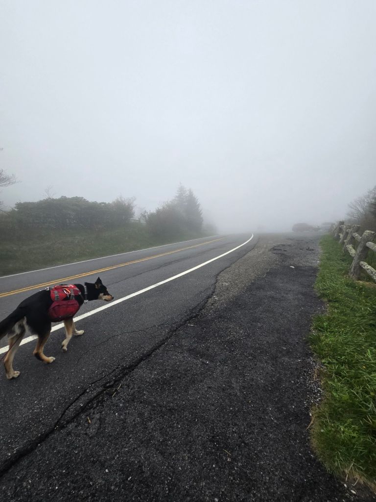 Bo and I walked through a Southern Spruce Pine forest up to Roan Knob, which had no view. There was a storm rolling in, and Bo and I kept getting blasted with foggy mist sweeping through the forest. Rocky Roan Mtn Shelter was closed for repairs, as well as the Cloud Hotel. Today was the biggest mile day for Bo and I. We planned to get off the mountain with the storm rolling in since there were so many snags, and the wind was really picking up. We went another mile down to the road by Carvers Gap. It was very foggy, misty, and rainy… just a sneak peak for what was to come tomorrow.